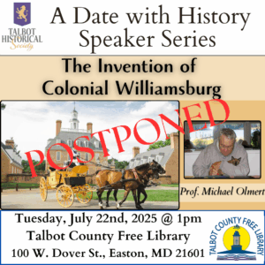 This is presented by the Talbot Historical Society in partnership with the Talbot County Free Library and will take place at the library located at 100 W. Dover St., Easton, MD 21601. The lecture will be presented on July 22nd at 1pm. The lecture is free to the public, but reservations are requested.