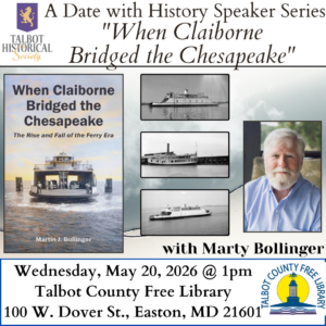 This is presented by the Talbot Historical Society in partnership with the Talbot County Free Library and will take place at the library located at 100 W. Dover St., Easton, MD 21601. The lecture will be presented on May 20, 2026 at 1:00pm at the Talbot County Free Library